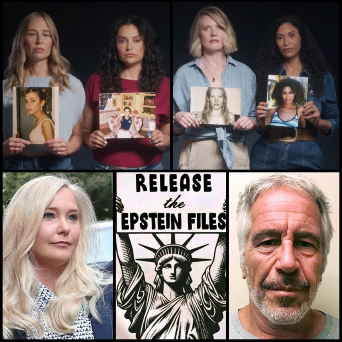 Top Row: Jeffrey Epstein victims holding pictures of their younger selves.